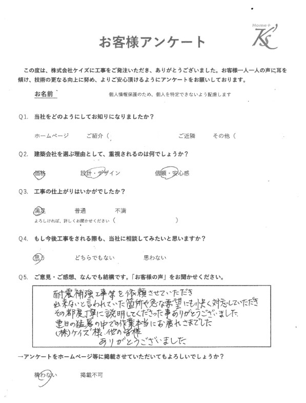 耐震補強工事等を依頼させていただき出来ないと言われていた箇所や急な要望にも快く対応していただき その都度丁寧に説明してくださった事ありがとうございました。 連日の猛暑の中での作業本当にお疲れさまでした (株)ケイズ様、他の皆様ありがとうございました